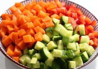 第二步,黃瓜和胡蘿卜清洗幹凈後,切成小丁,火腿片也切成小丁,大蔥切成蔥花備用
