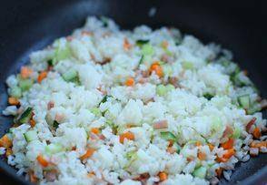 第五步,放入胡蘿卜丁和黃瓜丁,翻炒均勻後,倒入米飯,用勺子將米飯搗散,不用黏到一塊,翻炒均勻
