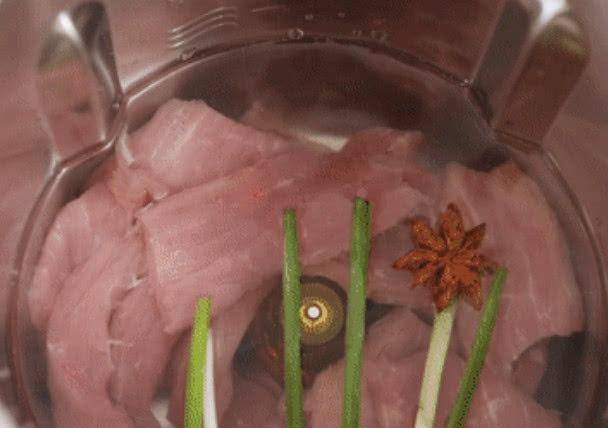 第二步,我用的是水煮炒制一體機,這個時候,拿出配套的攪拌勾,放在杯體中,倒上切好的肉塊,加上600克的清水,放入蔥段、八角和生抽
