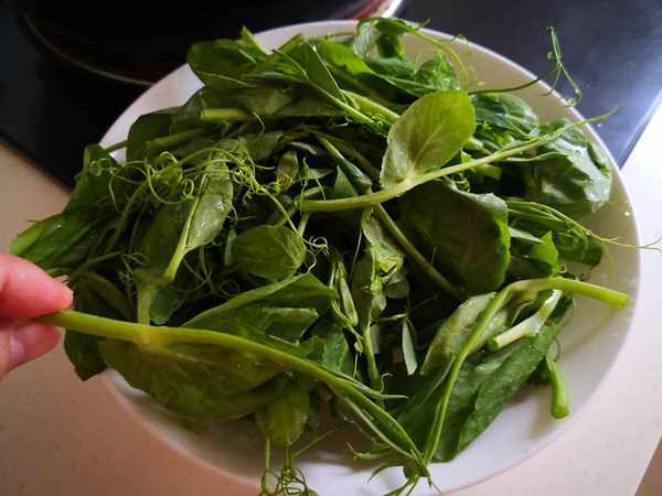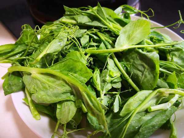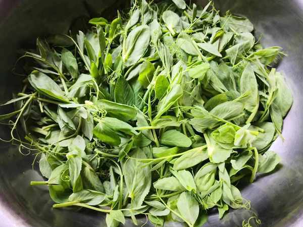 1.買回來的豌豆尖摘一下,去掉老硬的莖葉,豌豆尖的老葉和粗莖因為含有較多的纖維素,所以口感較硬,吃時不易嚼爛,所以要去掉;但如果買的豌豆尖較嫩也可以不摘,不過為瞭追求更好的口感,我每次都會再仔細摘一遍,隻留取最精華的部分。