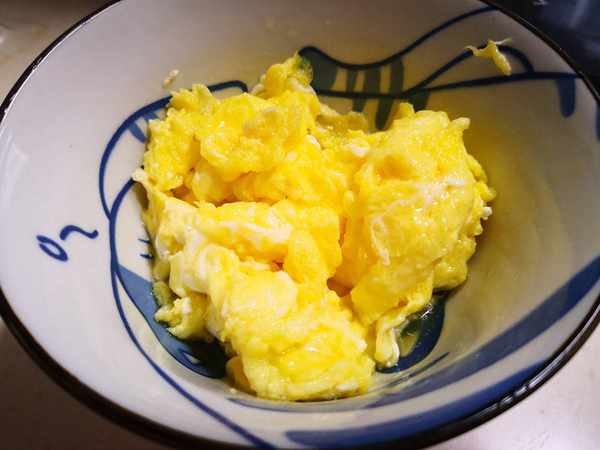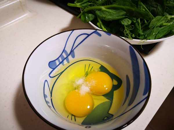 3.豌豆尖浸泡好後,控水取出稍微切一切,切成方便入口的段。然後起鍋加油,油溫4成熱的時候先倒入蛋液,煎至蛋液定型後,再用鏟子將其炒散,炒成大小均勻的雞蛋塊後盛入盤中備用。