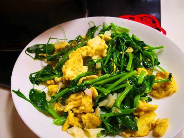 再將鍋中加少許油,燒熱後倒入蒜末炒香,炒出蒜香味後再放入豌豆尖,繼續快速翻炒至豌豆尖葉子變軟後加入雞蛋塊,翻炒均勻後加入一匙食鹽和少許雞精調味,再次大火翻炒均勻後就可以關火出鍋瞭,太香瞭!