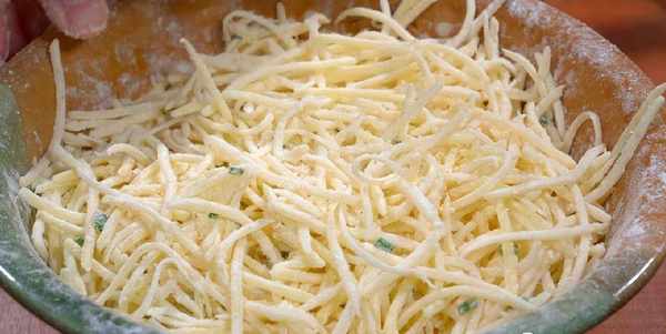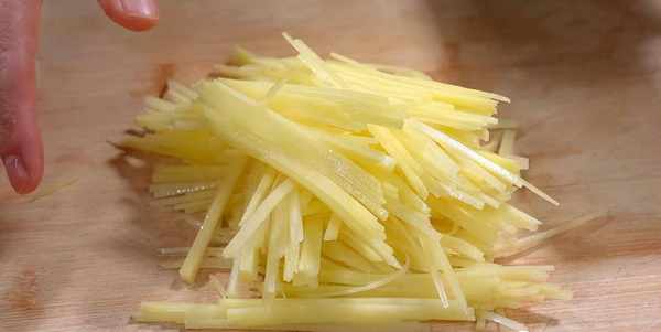 1.準備兩個土豆,用刮皮刀削去外皮,簡單清洗幾下,改刀切成細絲(也可以用擦絲器擦成細絲),切好後裝入碗中備用。