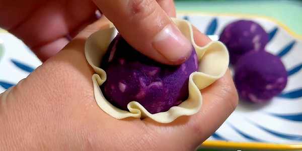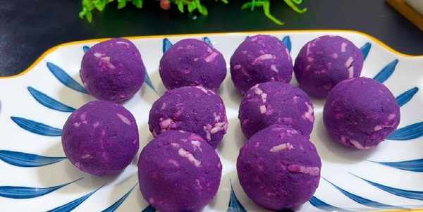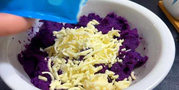 2.15分鐘後,紫薯蒸熟後倒入盆中。加入一勺白糖,用搟面杖搗成泥,如果感覺有點幹,可以加入少許牛奶,搗成非常細膩的狀態,再加入一點芝士奶酪碎,用手抓拌均勻,取一小塊,用手團成圓球備用。