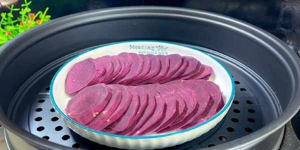 1.準備兩個紫薯削去外皮,放在案板上,切成薄片,切好後裝入盤中,放入蒸鍋內大火蒸15分鐘。