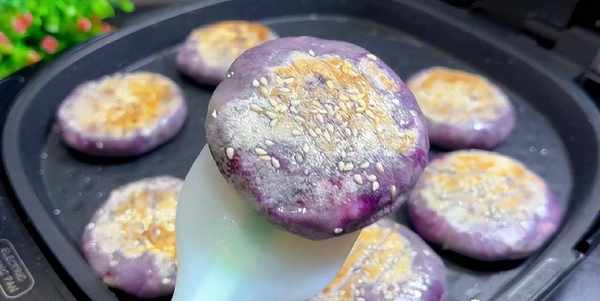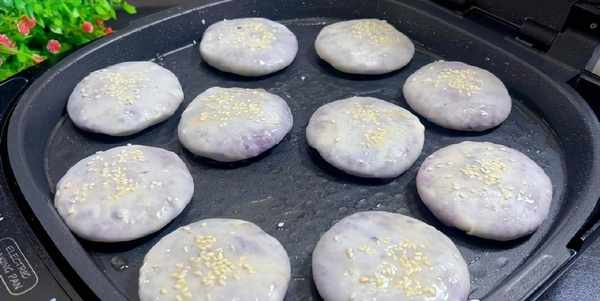 4.電餅鐺提前預熱,刷上食用油,放入紫薯餅, 在紫薯餅表面再刷上食用油,蓋上蓋子,烙至兩分鐘,翻個面,煎至兩面金黃就可以出鍋瞭。