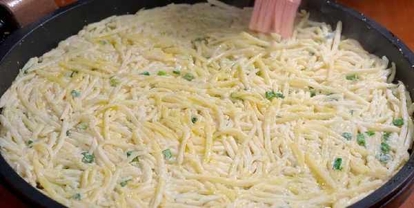 3.電餅鐺預熱,刷上食用油塗抹均勻,再土豆絲均勻的撒在電餅鐺上,用鏟子整理平整,在表面刷上食用油,扣上蓋子,中小火烙至六分鐘左右。