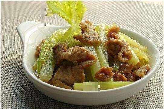 材料:西芹300克、豬瘦肉200克、鹽適量、油適量、醬油1勺、生粉1勺