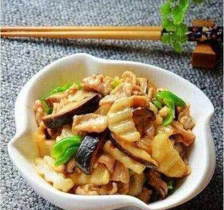 2、炒鍋倒油爆香蔥薑,倒肉片炒變色盛出。底油放香菇、山藥、加生抽、糖、鹽、水炒片刻,放青椒,入肉片炒勻,加雞精、香油炒勻。