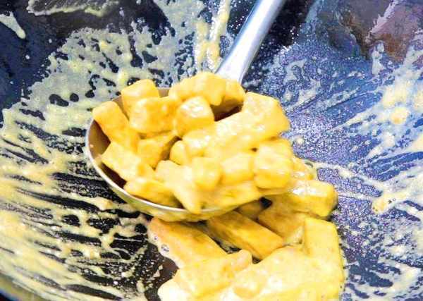 5、鍋內留少許底油,放入鴨蛋黃,連續攪拌,把蛋黃炒香,加入食鹽、白糖適量,攪拌化開,倒入南瓜條。