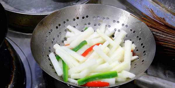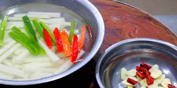 3.起鍋燒水加入白醋適量,水開後倒入山藥和青紅椒,推動幾下,焯水2分鐘,倒出控水再過一下涼水。