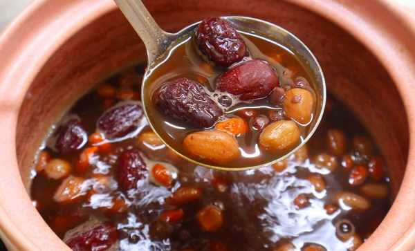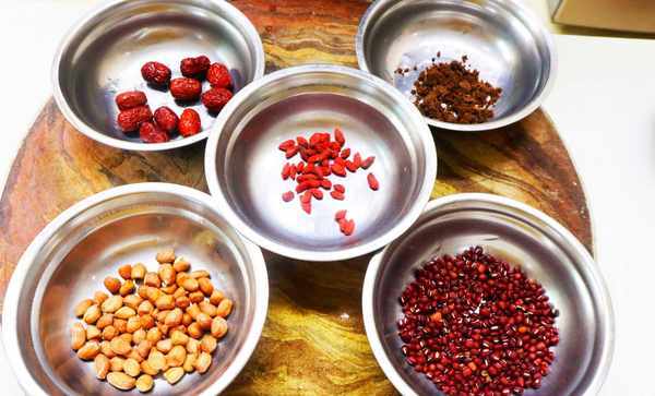 1.準備紅豆,花生米各一把,紅棗幾個,枸杞子一小把,紅糖一大勺備用。把紅豆和花生米分別清洗幹凈,浸泡一個小時。