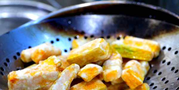 4、等油溫燒至5成熱時,下入南瓜條,用勺子繞鍋邊推動,改小火炸兩分鐘,炸至南瓜金黃酥脆時,即可倒出控油。