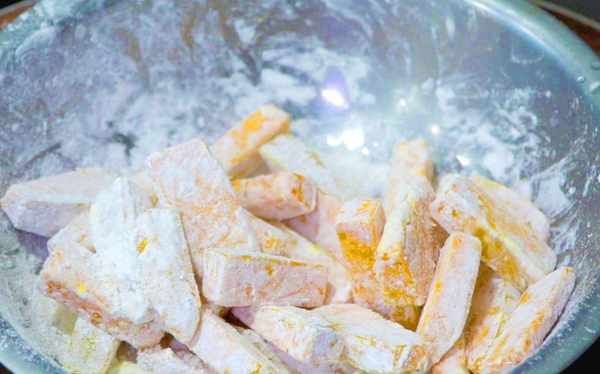 3、另起鍋添入食用油,再等待油燒熱的時間,把南瓜條放入盆中,加適量淀粉,顛盆拌勻。