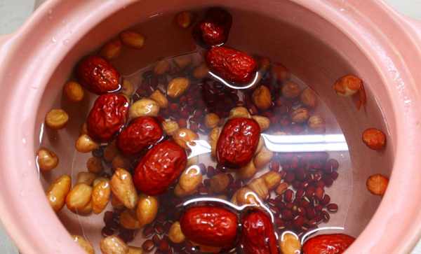 2.砂鍋裡面加適量的清水,分別下入紅豆,花生米和紅棗,開大火煮開,改成小火煮1個小時。