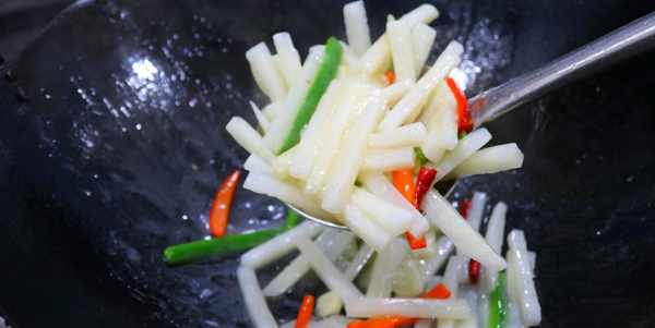 4.起鍋添入少許食用油,油熱後倒入蒜片和紅幹椒爆香,炒出蒜香味以後,再倒入山藥和青紅椒,顛鍋翻炒幾下,再淋入適量清水。