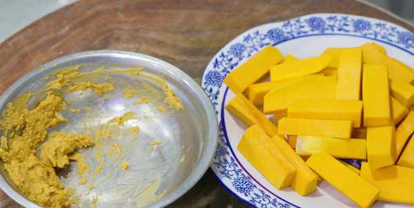 1、準備半個老南瓜,先切成長段,去掉瓜瓤,削去外皮,再切成長條,放入盤中;兩個煮熟的鴨蛋黃,用筷子碾碎備用。