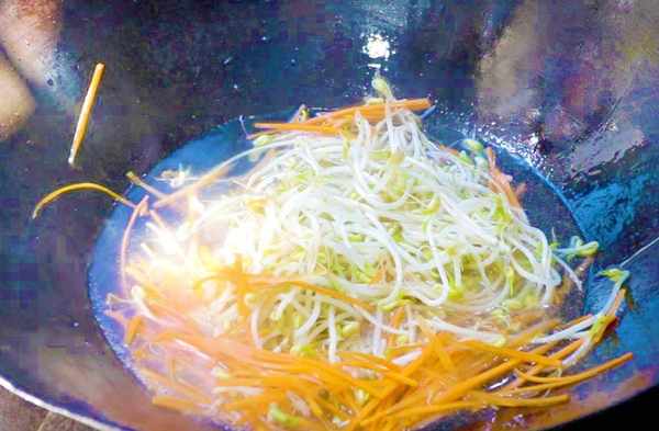 2、起鍋加適量清水,加入少許植物油,等水燒開後,下入胡蘿卜絲和綠豆芽,翻動幾下,焯水一分鐘,然後倒入漏勺中控水,再過一下涼水。