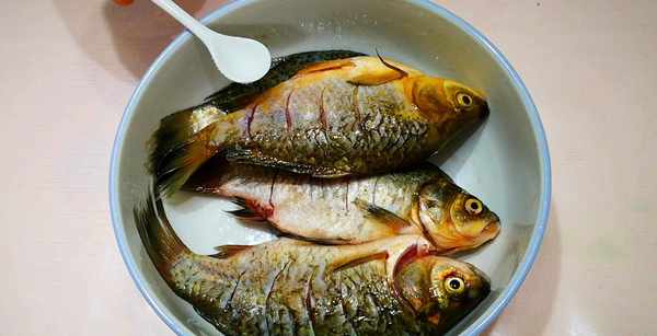 1.鯽魚處理幹凈內臟和魚鰓後斜著打花刀,然後加入適量的鹽入味、料酒去腥,醃制十分鐘備用。經過醃制的魚肉更結實,燉湯時,魚肉不易散花。