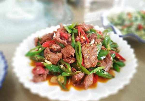 2.油鍋加熱,將醃制好的牛肉倒入快速翻炒至變色,盛出備用;用牛肉盛出後剩下的一些熱油,加入蒜片、蔥頭、辣椒爆香後;
