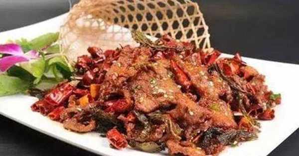 4、鍋內留底油燒熱,入筒筒辣椒、花椒炒至呈棕黑色,入薑片、蒜片炒香,入炸好的綠茶脆、爆好的牛肉,加鹽、味精、雞精、白糖、生抽翻炒均勻,亮油,起鍋裝盤即可。