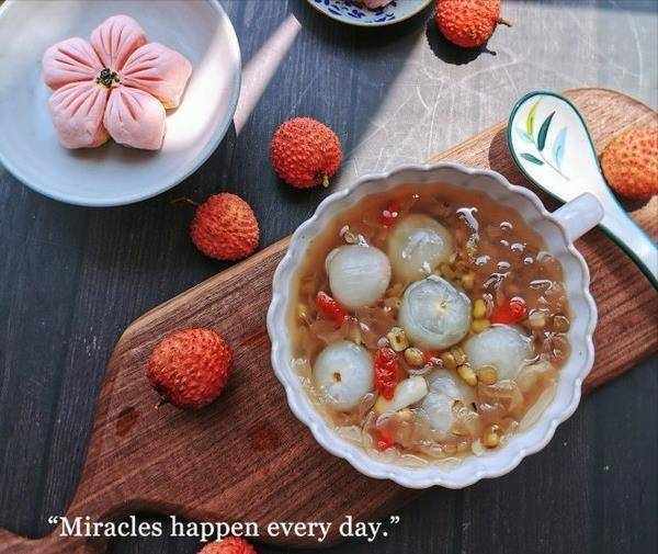 【材料】荔枝300g,綠豆50g,銀耳半小朵,枸杞1把,冰糖適量
