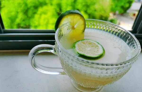 2、青檸切半,放入杯子裡