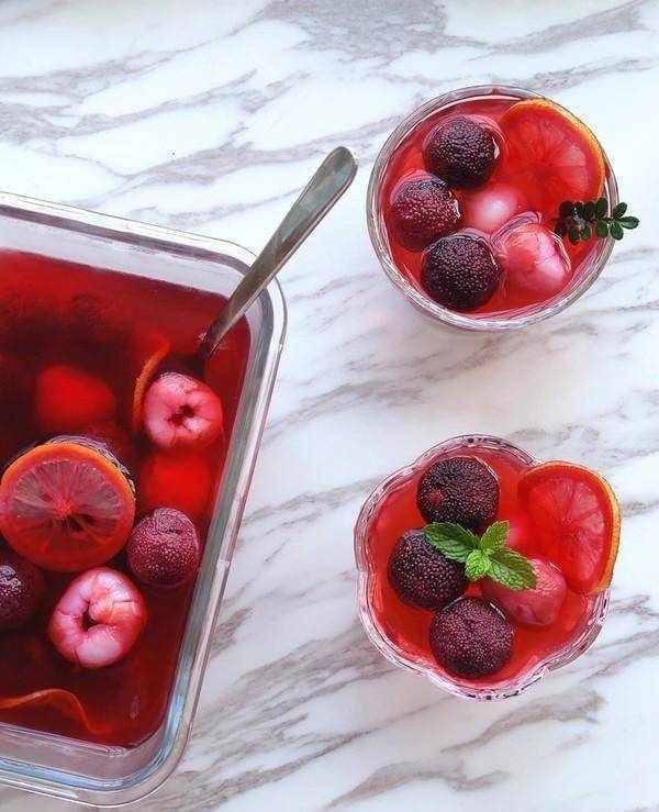 【材料】荔枝12顆,楊梅500g,冰糖50g,檸檬1個,水1000g