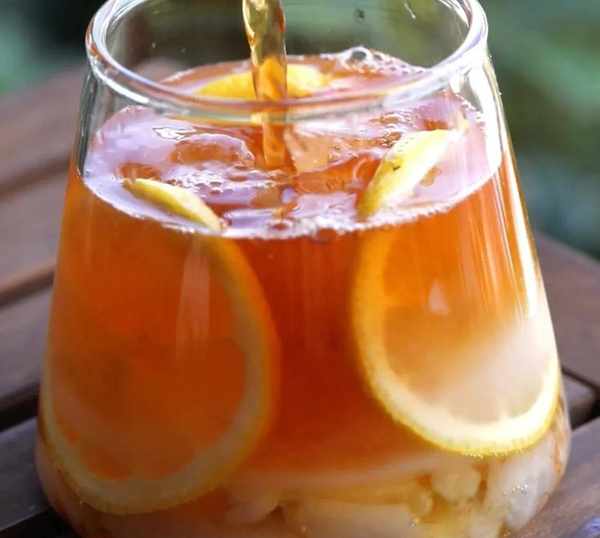 5、杯裡放入適量的冰塊、倒入檸檬汁、荔枝汁、紅茶、檸檬片攪拌