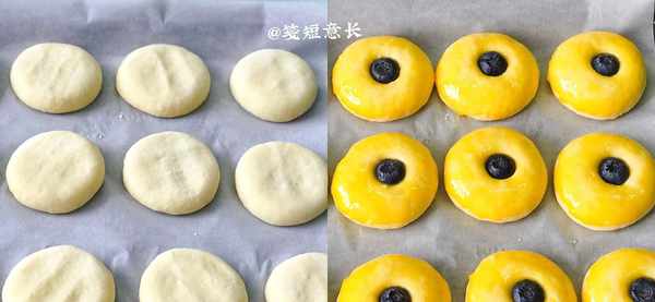 5、取出烤箱的烤盤,鋪一層隔油紙後將小面劑用掌心按扁,覆蓋一層保鮮膜後讓面劑二次醒發後刷一層雞蛋液,將洗幹凈的藍莓果輕輕按壓進去,藍莓山藥餅的餅坯就做好瞭。