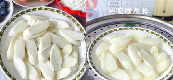 1、首先把山藥放在水龍頭下沖洗幹凈,削去粗糙的外皮後切成薄片,裝入盤中放進蒸鍋,大火蒸10分鐘即可。山藥切得越薄,蒸的時候就越節約時間。