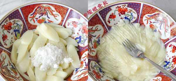 2、將蒸熟後的山藥倒入大口徑的碗中,方便待會兒揉面團。用吃飯的叉子將山藥按壓成細膩的山藥泥,喜歡吃甜味兒的可以加點兒白砂糖,山藥泥的餘溫恰好可以把白砂糖融化。