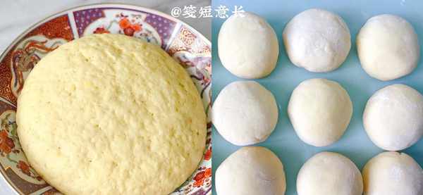 4、發酵好的面團明顯增大兩倍,用手挑開表層能看到內層這種密集的蜂窩就可以瞭。面墊上撒一層幹面粉,挖出面團揉面排氣,然後分成等份的小面劑揉搓光滑。
