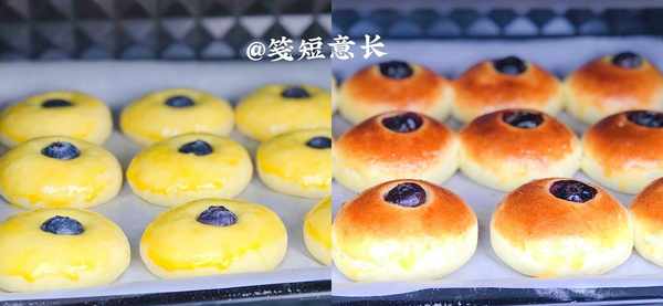 6、烤箱提前預熱後放入二次發酵好的藍莓山藥餅坯,170度烤15分鐘。最後幾分鐘根據自傢烤箱火力大小適量調整烤制時間,註意別烤糊瞭就行。傢裡沒有烤箱也可以直接蒸成小饅頭。