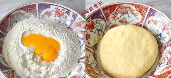 3、山藥泥處理好之後不用加一滴水,直接倒入150克面粉,磕入1個雞蛋,加3克酵母粉,用筷子攪勻後揉成面團,最後蓋上一層保鮮膜後將面團靜置,等待發酵。