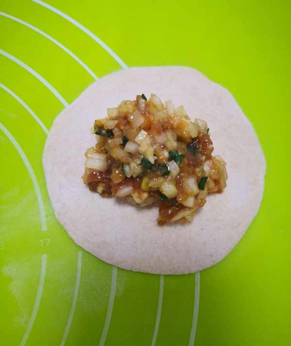 把面劑子搟成中間厚、邊緣薄的圓面片,加適量餡。