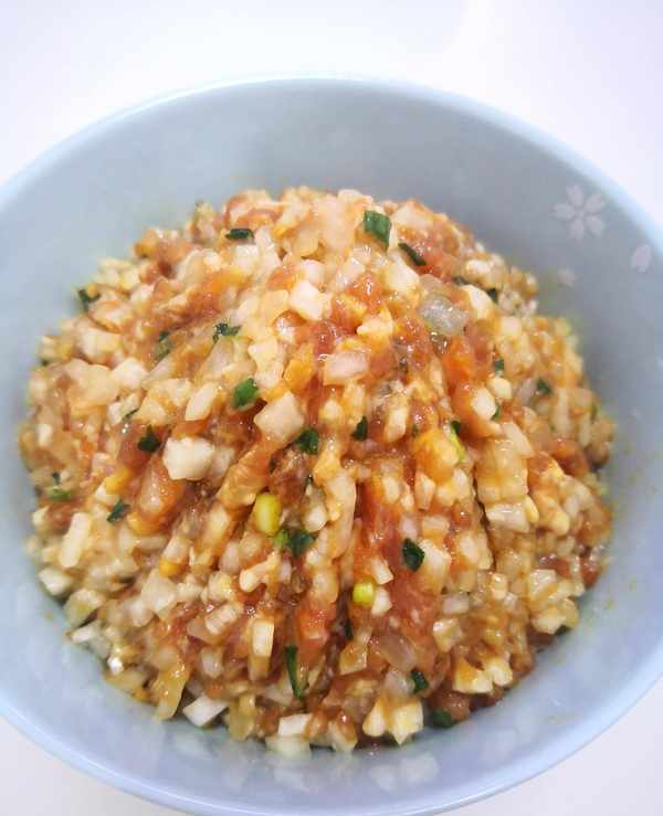 餡料的調制:蘿卜切成丁後加鹽拌均勻靜置10至20分鐘。