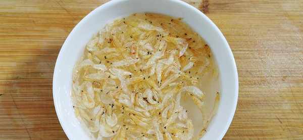 第二步:準備一個小碗,放入一把幹蝦皮,用流動的清水清洗一下蝦皮,可以去除蝦皮表面的灰塵,然後再倒入純凈水,蝦皮浸泡10分鐘即可。曬幹的蝦皮中含有甲基亞硝胺,可以有效地去掉,還可以泡去蝦皮本身的難聞氣味。