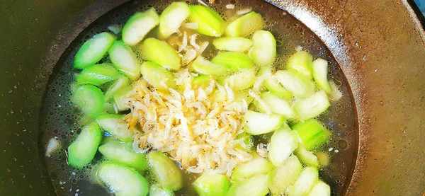第三步:熱鍋涼油,油熱放入蒜片炒出香味,再放入絲瓜,炒至絲瓜變軟後,放入適量的純凈水,水開後放入泡好的蝦皮。