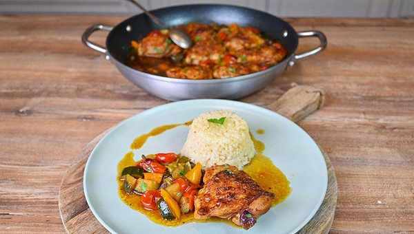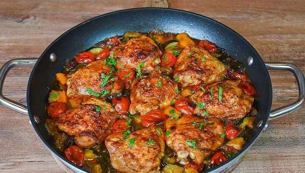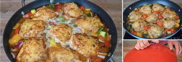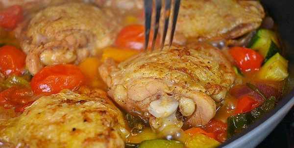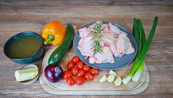 8隻雞大腿——盡可能多地放入鍋中一層、10個櫻桃番茄、1個小南瓜、1個中號紅洋蔥、4 - 5個蒜瓣、1個燈籠椒(黃色或紅色)、2根蔥、2-3湯匙黃油、加鹽和胡椒調味、一茶匙紅辣椒粉、一茶匙蒜粉、一茶匙洋蔥粉、1.5杯雞湯或高湯、1-2枝迷迭香