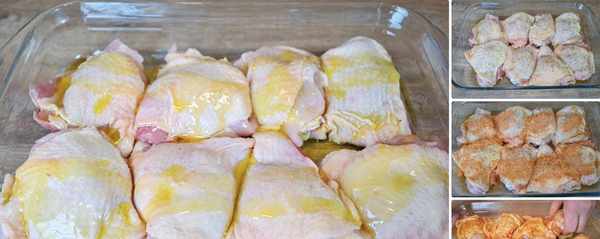 在一個大的平底鍋中加熱一些橄欖油,把雞大腿從兩面煎成棕色。每一面煎2-3分鐘,然後把鍋裡的雞肉放在一邊。