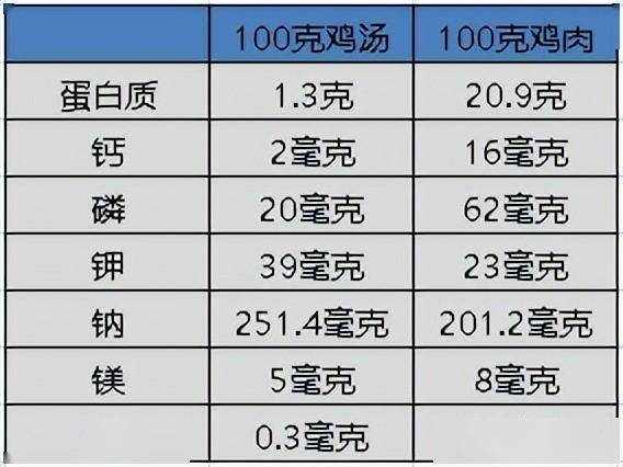 無論是蛋白質、還是鈣鐵鋅等營養元素的含量, 雞肉都遠大於雞湯。