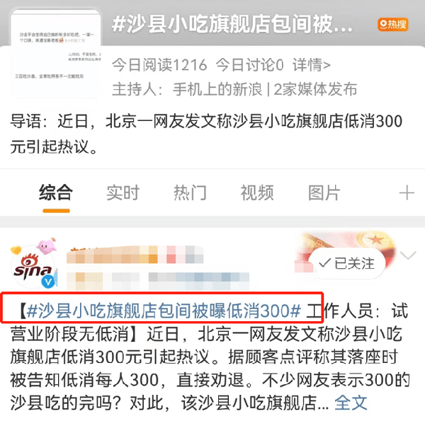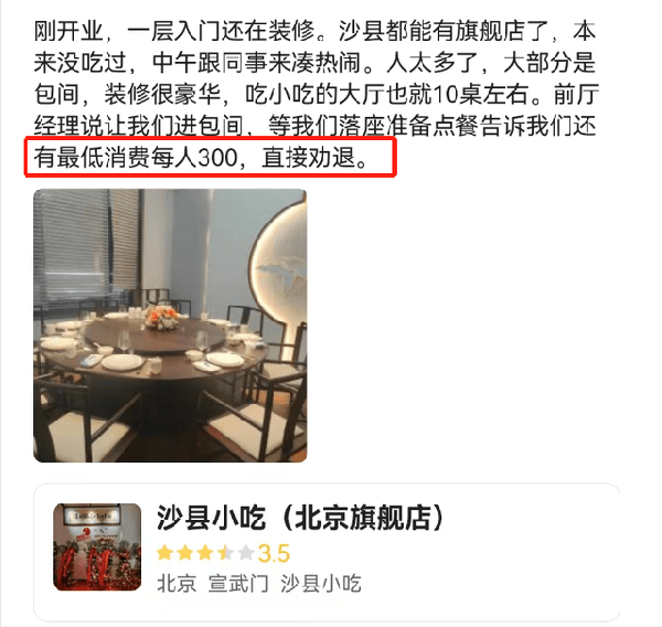 北京的一傢沙縣小吃旗艦店,被曝給包間設最低消,有網友去消費時被告知包間低消300,而且還是人均300。