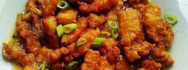 2、把切好的碎肉,放入面糊中,醃制10分鐘。油中火燒熱,把拌上面糊的碎肉炸至7分熟。