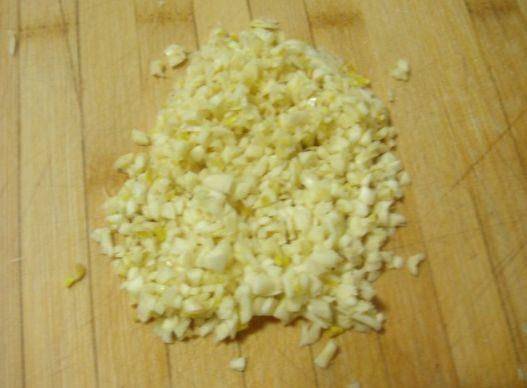 制作過程:第一步,將大蒜剝掉皮,在剝皮的時候,用刀背在大蒜上面拍一下,能夠更加容易的剝皮,剝皮後的大蒜切成碎末