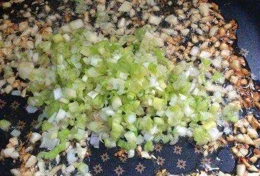 第三步,在炒鍋裡面放上油,油熱後,倒上切好的蒜末,開小火炸至金黃色的時候,放入蔥花翻炒一會