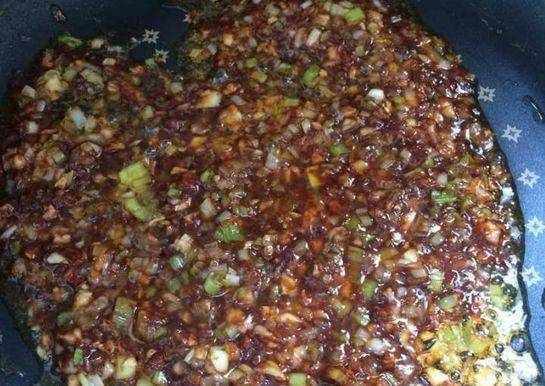 第四步,加上蒜蓉辣醬和甜面醬,翻炒均勻後,加上少許的生抽和香油,翻炒均勻後,就可以出鍋瞭,將炒好的醬汁裝在碗中