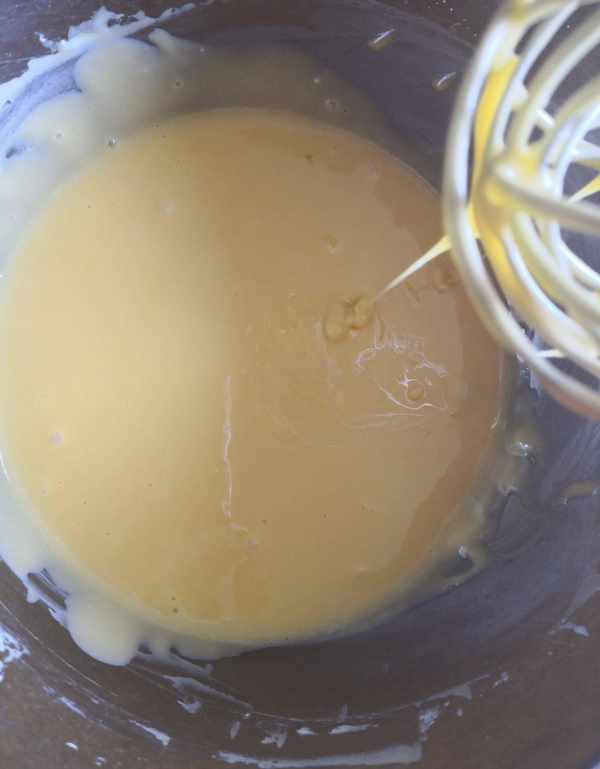 4、慢慢將豆漿倒入蛋黃糊中,一邊不停攪拌,直至豆漿完全加入。