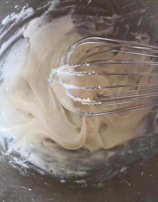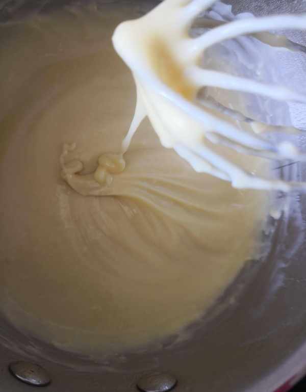 6、直到打蛋頭劃過有明顯痕跡,面糊可以掛在蛋抽上,馬上離火!