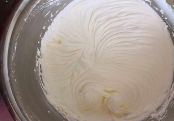 1、 淡奶油中一次性加入糖,打發到裱花狀態,裝入裱花袋備用。